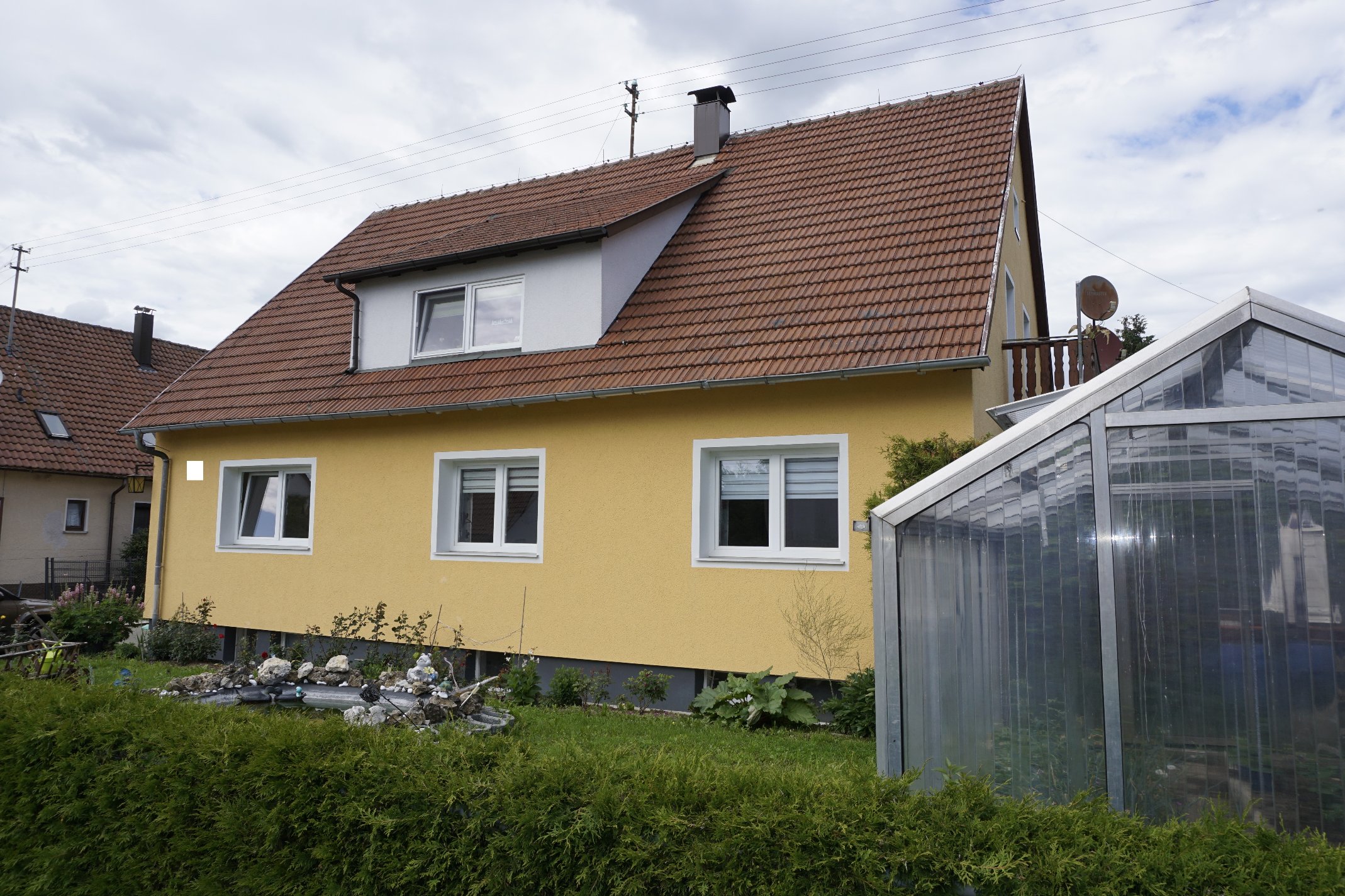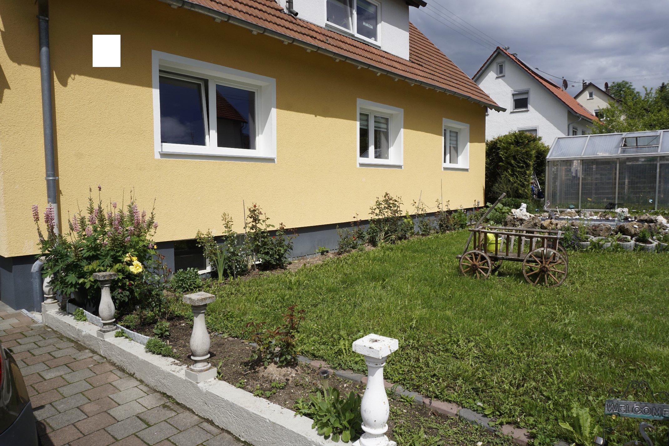 Außenanlage: Neben dem Garten mit Gewächshaus, gibt es eine kleine und eine große Terrasse einen Teich, eine Vogelvoliere und zwei Garagen mit Stellplätzen im Hofraum. Der Hof ist mit Pflastersteinen versehen und pflegeleicht.