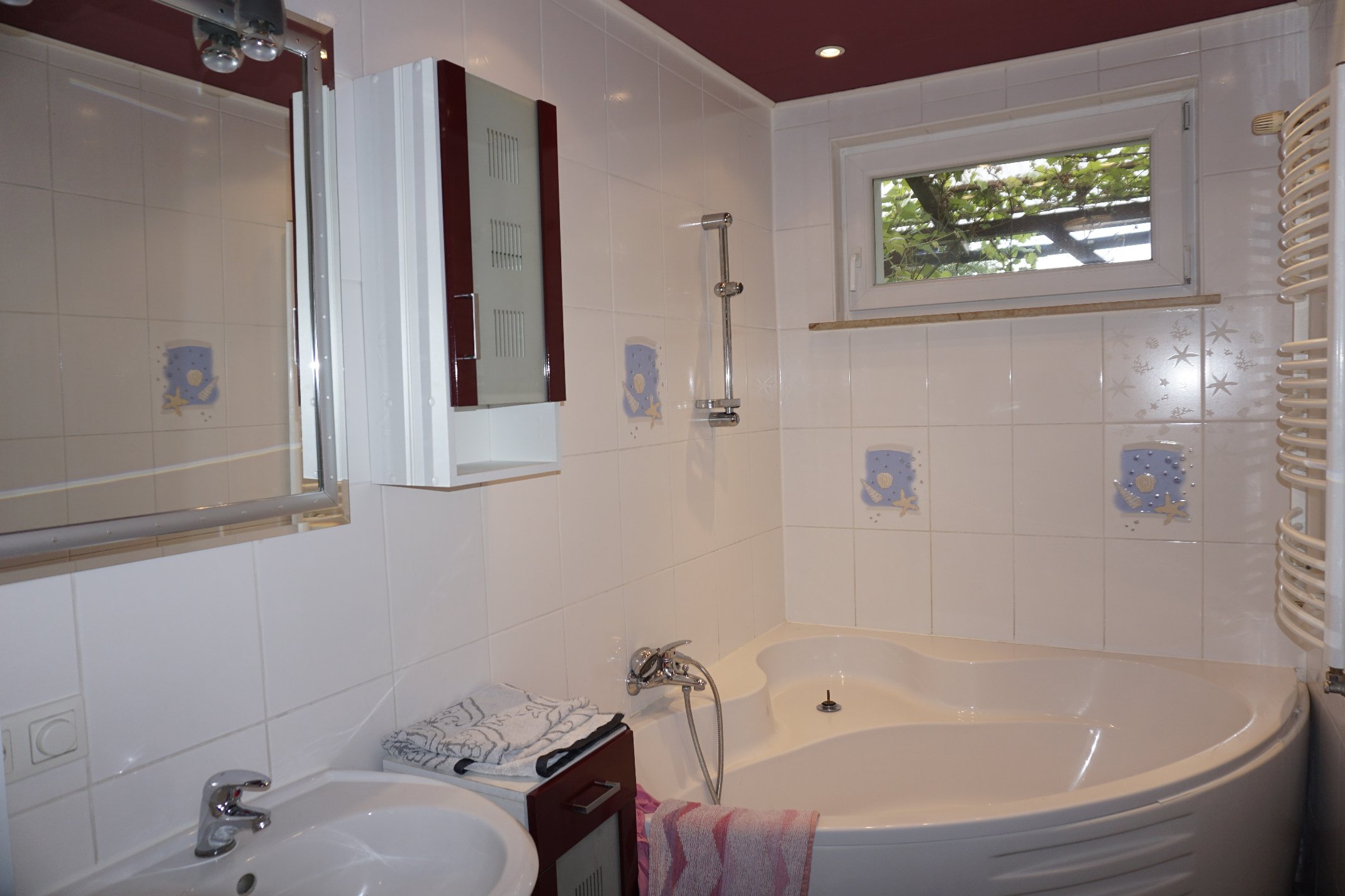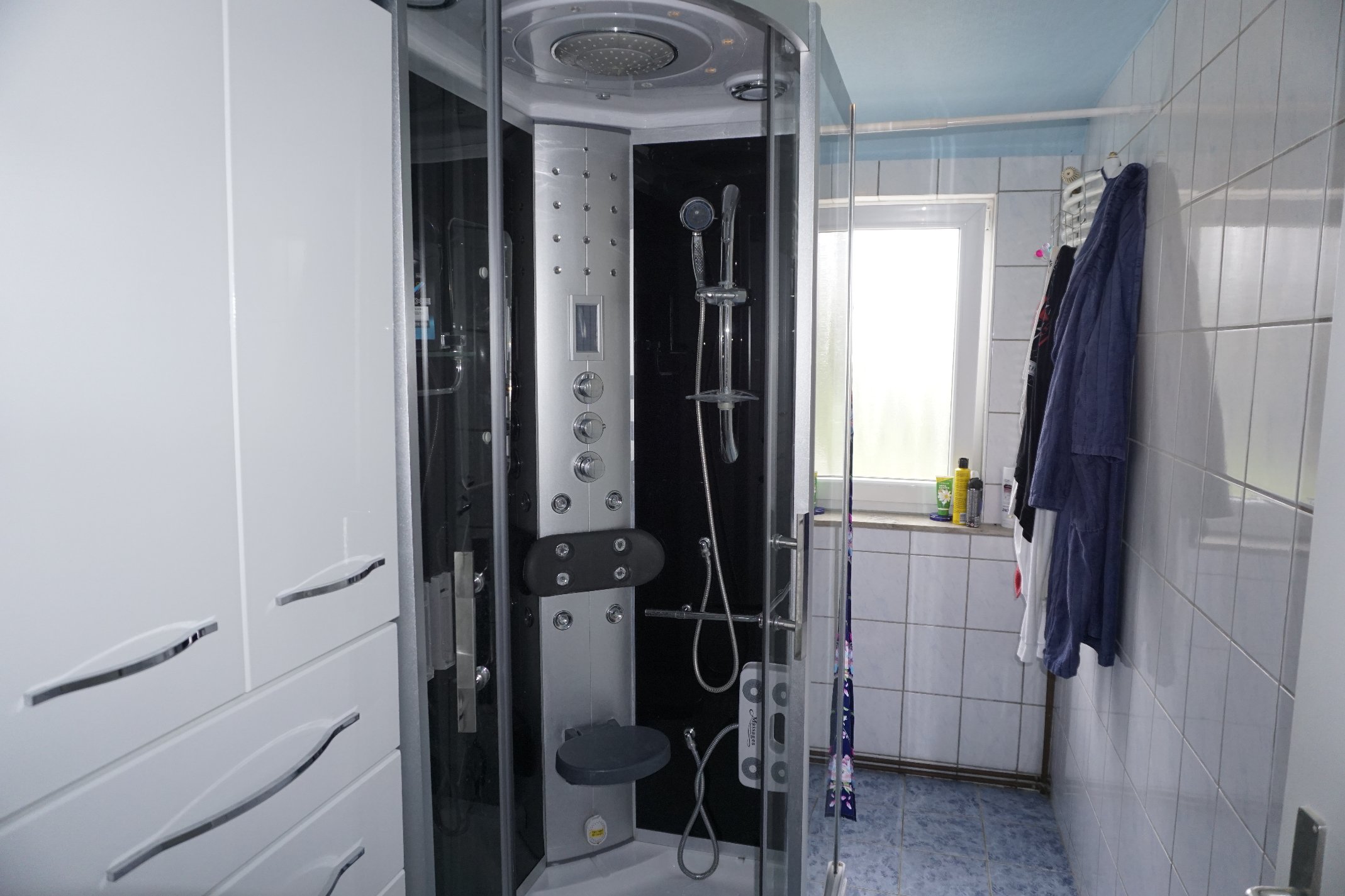 - Ausstattung des Bades Dusche, Fenster, Badewanne